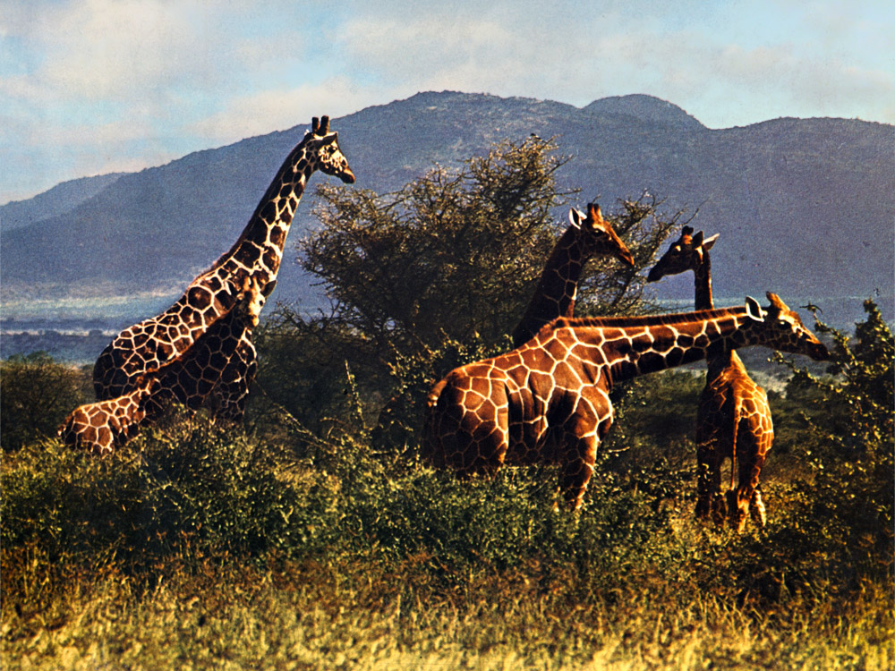 Se caracteriza por la extraordinaria longitud de su cuello, por sus altas patas y por presentar la línea del dorso muy inclinada. Esa longitud del cuello y la altura de las patas hacen de la jirafa el más alto y también, proporcionalmente, el más corto de todos los mamíferos. Vive en las estepas en las que haya árboles y matorrales, y casi nunca se la encuentra en lugares montañosos. Suele vivir en rebaños de diez a quince individuos, pero allí donde tiene la seguridad de poderse defender de sus enemigos se reúne en grupos mucho más numerosos. Debido a sus caracteres físicos, la jirafa es un animal poco apto para pastar la hierba; en cambio alcanza con la mayor facilidad, las hojas de los árboles: para ello se vale de la lengua, extremadamente movible y con la que logra atrapar hasta las cosas más diminutas. Las jirafas se alimentan principalmente de ramas, hojas y yemas de mimosa, aunque también les gustan las hojas de las plantas trepadoras que, en gran número, cubren los árboles de los bosques africanos. Cuando se nutre con alimentos frescos y jugosos puede permanecer mucho tiempo sin agua, pero en las épocas de sequía recorre varios kilómetros para abrevar en las lagunas pantanosas o en las charcas. El apareamiento entre las jirafas se produce en marzo o a principios de abril, y el parto en mayo o junio del año siguiente, es decir, tras una gestación que oscila entre 420 y 450 días.
